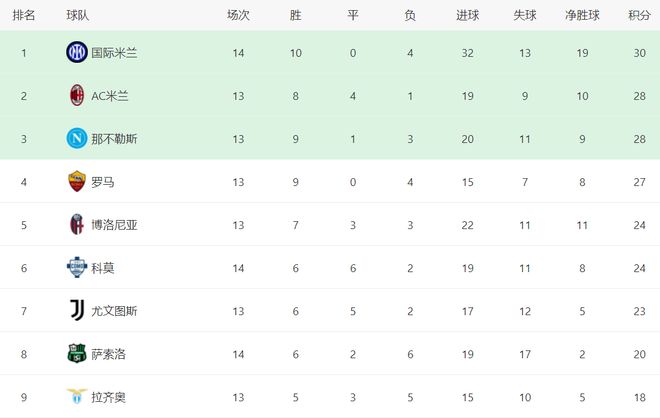 在積分榜上,國際米蘭暫時登上榜首位置。國際米蘭10勝4負,拿到30個積分。而AC米蘭和那不勒斯都是28分,排名第2和第3名。不過,AC米蘭和那不勒斯比國際米蘭少踢1輪。羅馬以27分排名第4。第5的是博洛尼亞,拿到24分。輸球的科莫也是24分,排名第6。尤文圖斯以23分排名第7。薩索洛20分排名第8。拉齊奧只拿到18分,排名第9。