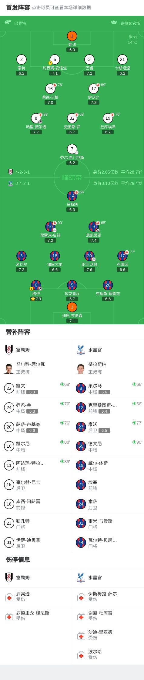 北京時間12月8日英格蘭足球頂級聯賽 聯賽 第15輪,富勒姆主場對陣水晶宮。上半場亞當-沃頓助攻恩凱蒂亞破門,之后富勒姆流暢配合,希門尼斯助攻哈里-威爾遜外腳背破門。下半場皮諾開出角球,格伊頭球絕殺。最終水晶宮2-1客勝富勒姆。