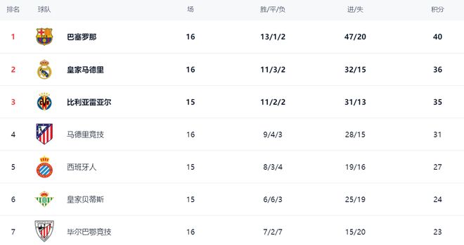 在積分榜上,巴薩以40分排名榜首。皇馬依然停留在36分,排名第2。皇馬連續5場聯賽中贏了1場,讓爭冠前景不斷惡化。阿隆索的帥位不穩了。比利亞雷亞爾以35分排名第3,接下來有希望超越皇馬。馬競以31分排名第4。西班牙人總積分達到27分,排名第5。皇家貝蒂斯以24分排名第6。