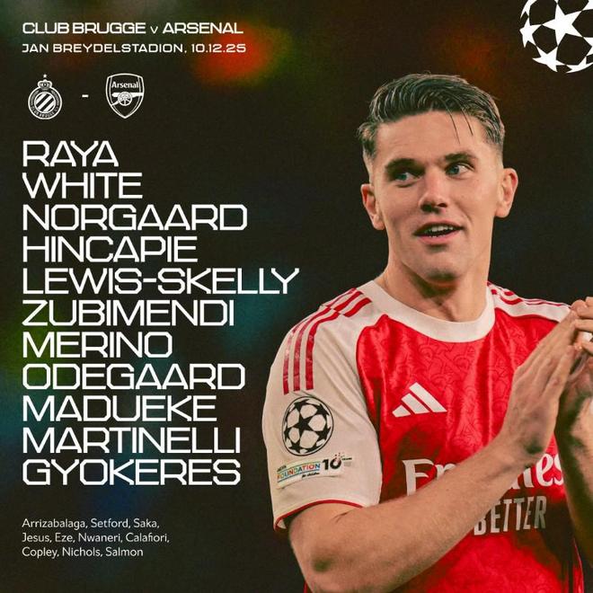 北京時間12月11日4:00,歐冠聯賽階段第6輪,阿森納作客揚-布雷德爾球場挑戰布魯日,本場主裁判為雅布隆斯基,賽前雙方首發出爐。阿森納首發:1-戴維-拉亞、4-本-懷特、16-內爾高、5-因卡皮耶、49-劉易斯-斯凱利、36-蘇比門迪、23-梅里諾、8-厄德高、20-馬杜埃凱、11-馬丁內利、14-哲凱賴什替補:13-凱帕、35-塞特福德、7-薩卡、9-熱蘇斯、10-埃澤、22-恩瓦內里、33-卡拉菲奧里、38-路易-科普利、48-喬希-尼科爾斯、89-馬利-薩蒙【上咪咕獨家看英超】