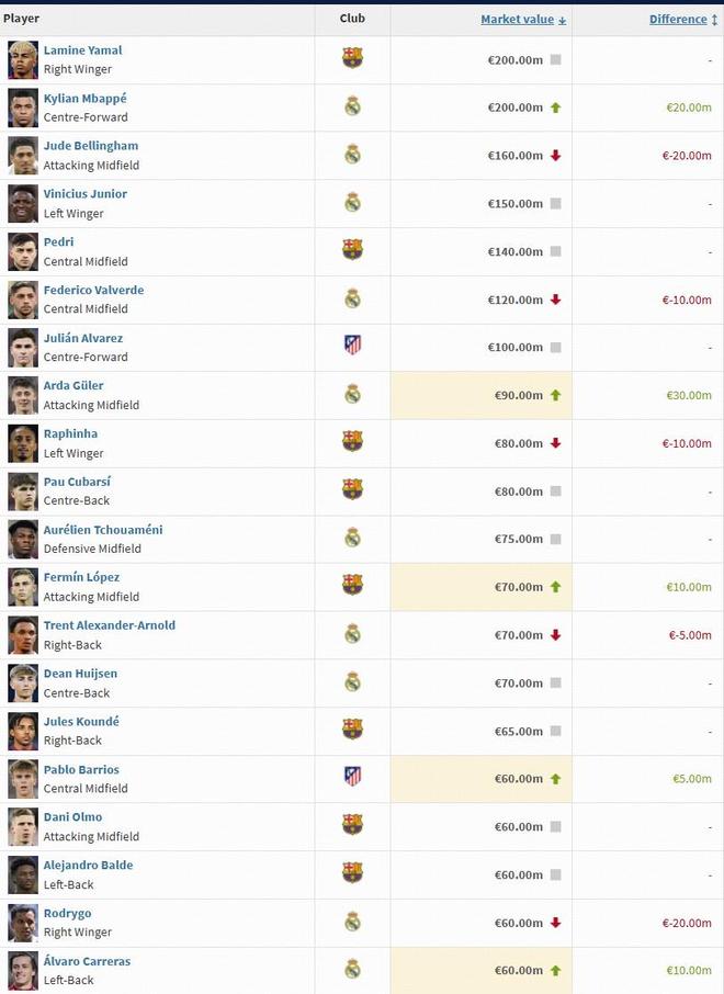 北京時間12月12日,德國轉會市場公布了最新一期西甲球員身價。亞馬爾、姆巴佩2億歐并列第一,7人身價上億。本次身價更新中,亞馬爾身價保持不變,仍為2億歐。姆巴佩身價上漲2000萬歐,與亞馬爾并列第一。貝林厄姆身價下跌2000萬歐,跌至1.6億歐元,位列第三。維尼修斯和佩德里身價保持不變,分列第四、第五。巴爾韋德身價下跌1000萬歐,身價來到1.2億。阿爾瓦雷斯身價保持不變,保持在1億關口。這樣,本次身價更新后,西甲有七位球員身價上億。西甲身價TOP20西甲身價漲幅前十西甲身價跌幅前十