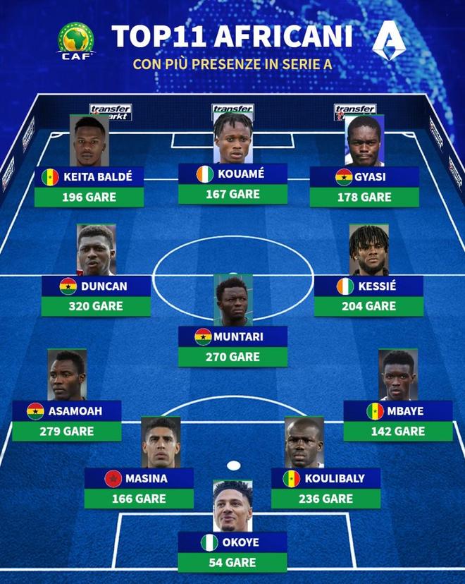 北京時間12月13日,德轉列出了意甲聯賽歷史出場次數最多的非洲球員11人陣容,庫利巴利、凱西、蒙塔里、阿薩莫阿以及凱塔-巴爾德在列。