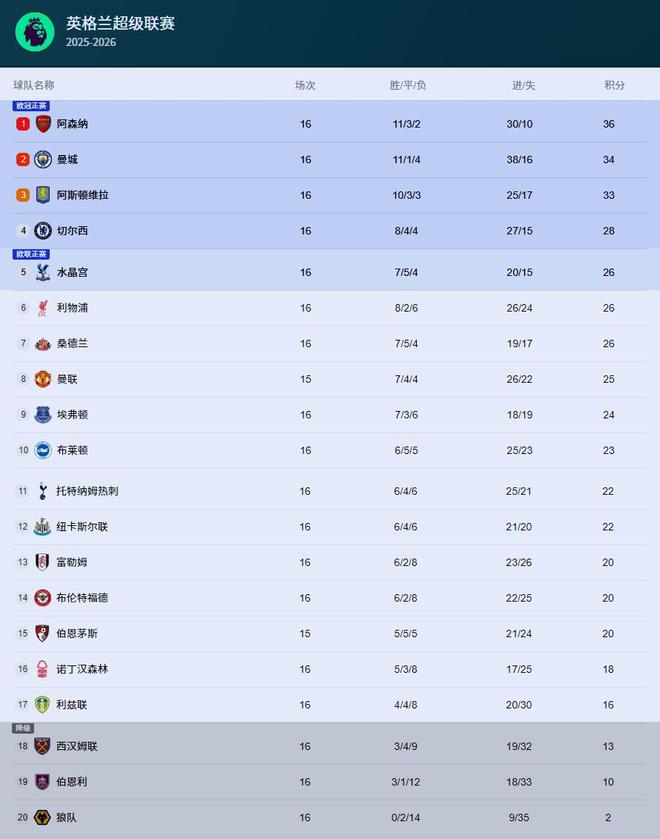 隨著諾丁漢森林3-0托特納姆熱刺、桑德蘭1-0紐卡斯爾聯、西漢姆聯2-3阿斯頓維拉、水晶宮0-3曼城,英超第16輪最新積分榜出爐!