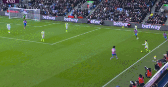 第41分鐘,B席右路回做,努內斯斜傳送到禁區后點,哈蘭德頭球攻門得手,曼城1-0水晶宮!哈蘭德展現了超高效率,他在上半場比賽僅有9次觸球、2次對方禁區內觸球和1次射門,就取得了一粒進球!