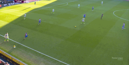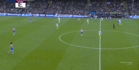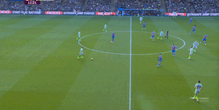 邊后衛奧賴利拉到了邊路,福登則出現在左肋的位置,所以當福登回撤接球,從而吸引出水晶宮的右中衛理查茲的時候,身后便出現了空當,這就是賴因德斯通過插上形成的機會: