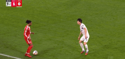 第28分鐘,拜仁右路壓上,奧利斯人球分過過掉李在成,突到禁區前沿直塞,凱恩插上禁區內橫傳門前,左側無人防守的格納布里倒三角再將球回傳到門前,卡爾小禁區內搶點將球擋入球門,拜仁1:0首開紀錄。上半時補時階段,美因茨獲得禁區右側前沿位置不錯的任意球機會,博文操刀主罰兜傳門前,這個球傳的很好,剛好繞過前點眾人,波圖爾斯基后點高高躍起近距離強力頭槌攻門,皮球應聲入網,美因茨半場壓哨破門,1:1扳平比分。