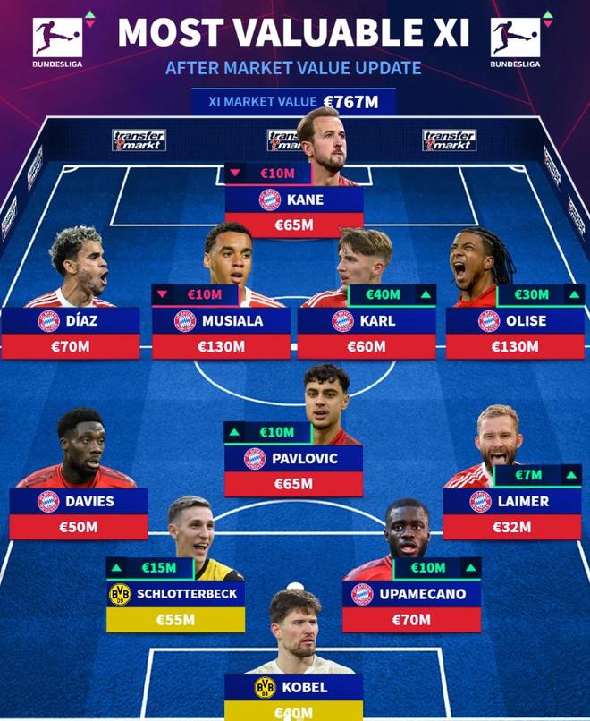 亞歷山大-帕夫洛維奇(拜仁慕尼黑)6500萬歐元(+1000萬)、奧利塞(拜仁慕尼黑)3200萬歐元(+700萬)、倫納特-卡爾(拜仁慕尼黑)6000萬歐元(+4000萬)、穆西亞拉(拜仁慕尼黑)1.3億歐元(-1000萬)、路易斯-迪亞斯(拜仁慕尼黑)7000萬歐元